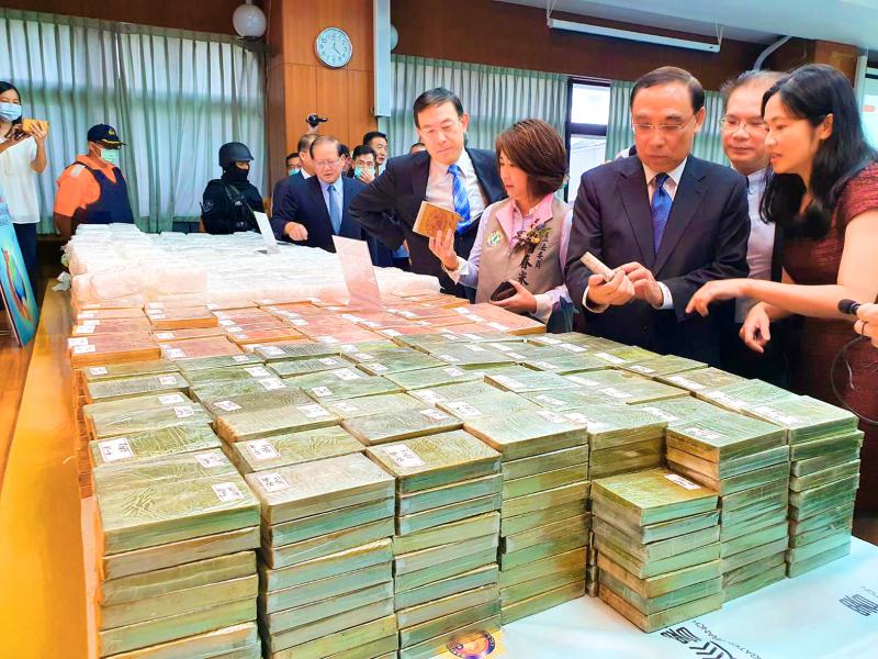 Minister of Justice Tsai Ching-hsiang (蔡清祥) and Taiwan High Prosecutors’ Office Chief Prosecutor Hsing Tai-chao (邢泰釗) held a news conference on what is one of the nation’s biggest drug trafficking cases.