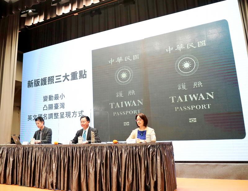 The design entails minimal changes, highlights “Taiwan” and changes the way in which the nation’s official title is displayed, Minister of Foreign Affairs Joseph Wu (吳釗燮) told a news conference in Taipei.