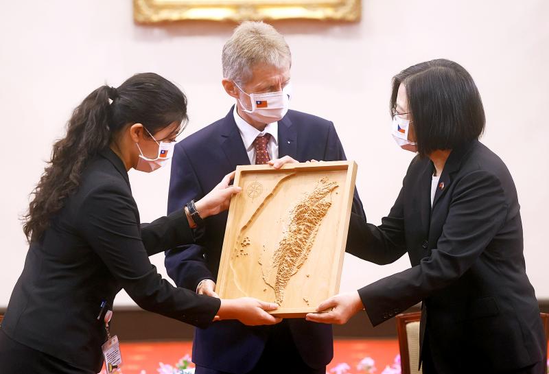 Vystrcil also presented gifts of a cross of Czech garnet, which suggests rebirth and resurrection, and a Moldavite “guardian angel” to safeguard Taiwan’s democracy and sovereignty.