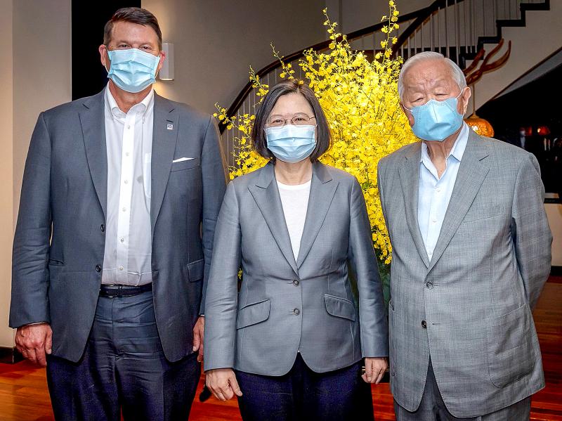 After hosting an evening banquet with delegation members at the presidential residence on Friday, President Tsai Ing-wen (蔡英文) posted several photographs of the meeting on Facebook, which showed that Taiwan Semiconductor Manufacturing Co (台積電) founder Morris Chang (張忠謀) also attended the dinner.