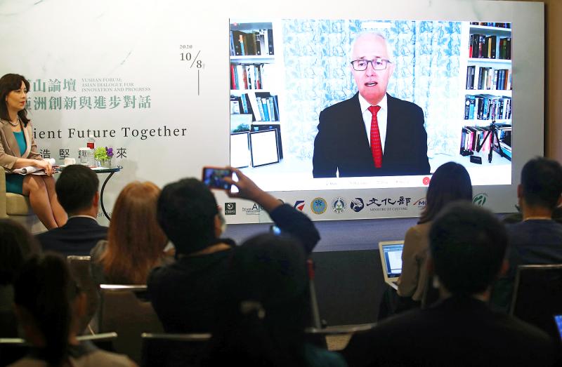 Former Australian prime minister Malcolm Turnbull yesterday urged solidarity between all democratic nations in the Indo-Pacific region to ensure regional prosperity and peace, while former Swedish prime minister Carl Bildt raised concerns about China’s “wolf warrior” diplomacy at the Yushan Forum in Taipei.