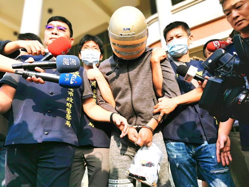 Yesterday afternoon, police escorted him in handcuffs and leg shackles from Tainan’s Gueiren Police Precinct to Kaohsiung’s Ciaotou District Prosecutors’ Office for further questioning.