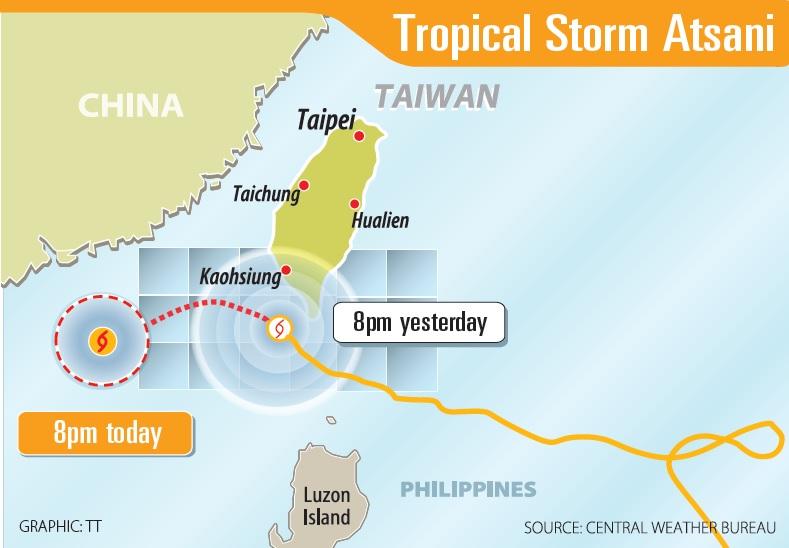 As of 9pm, Atsani was about 70km south-southeast of Oluanpi (鵝鑾鼻), the southernmost part of Taiwan, heading west-northwest, the CWB said.