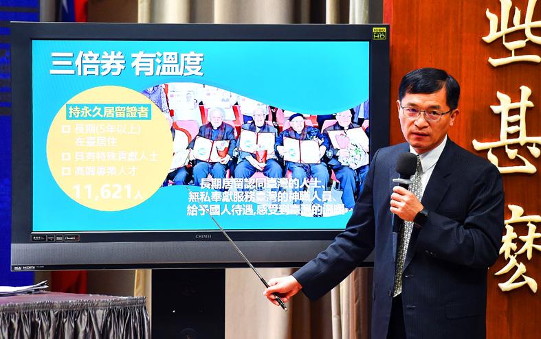 National Development Council Minister Kung Ming-hsin (龔明鑫) at a Cabinet meeting two weeks ago proposed that foreign nationals be made eligible for the program, Executive Yuan spokesman Ting Yi-ming (丁怡銘) told a news conference after the Cabinet meeting.