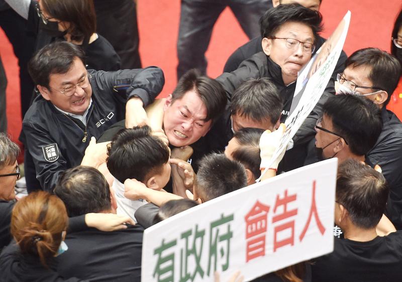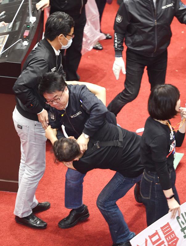At one point, KMT Legislator Sra Kacaw (鄭天財) was knocked over by Taiwan Statebuilding Party Legislator Chen Po-wei (陳柏惟) when he bent over to grab a garbage bag. KMT caucus whip Lin Wei-chou (林為洲) and others leaped forward to drag Chen away by the neck, causing a scuffle to erupt that was quelled by DPP lawmakers.