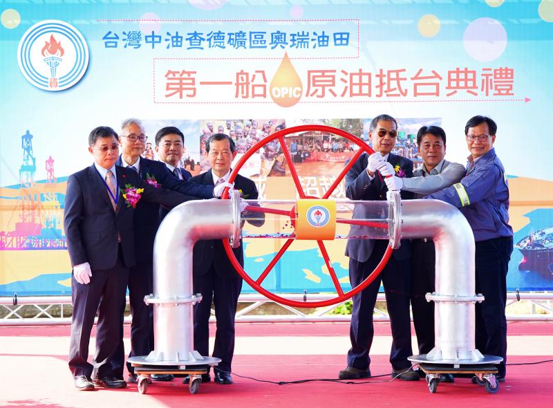 The first shipment of oil from CPC Corp, Taiwan’s (CPC, 台灣中油) oil fields in Chad arrived in Kaohsiung Port yesterday, heralded by water cannon boats.