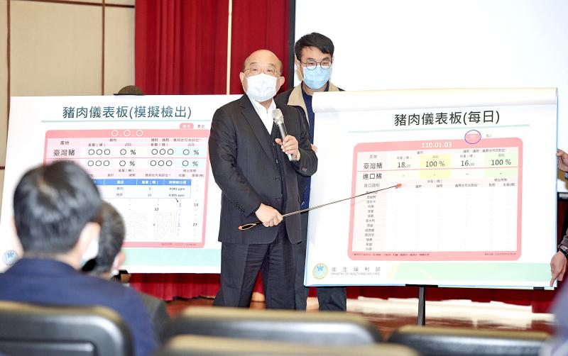 Premier Su Tseng-chang (蘇貞昌) yesterday inspected how pork imports are examined batch by batch at the Port of Taipei.