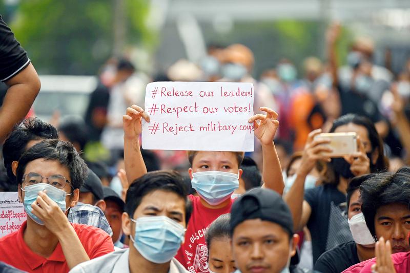 Myanmar yesterday saw its largest anti-coup protests yet, with young demonstrators spilling on to the streets to denounce the country’s new military regime, despite a nationwide Internet blackout aimed at stifling a growing chorus of popular dissent.