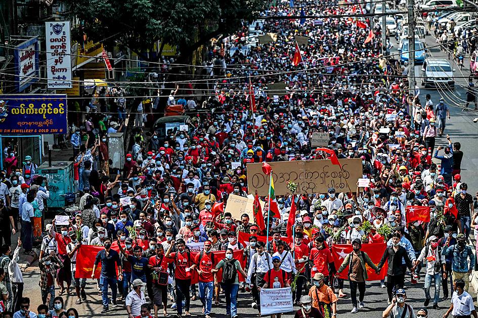 Tens of thousands of protesters yesterday poured on to the streets of Yangon in the biggest rally yet against the Myanmar coup, as an Internet blackout failed to stifle growing outrage at the military’s ouster of Burmese state counsellor Aung San Suu Kyi.