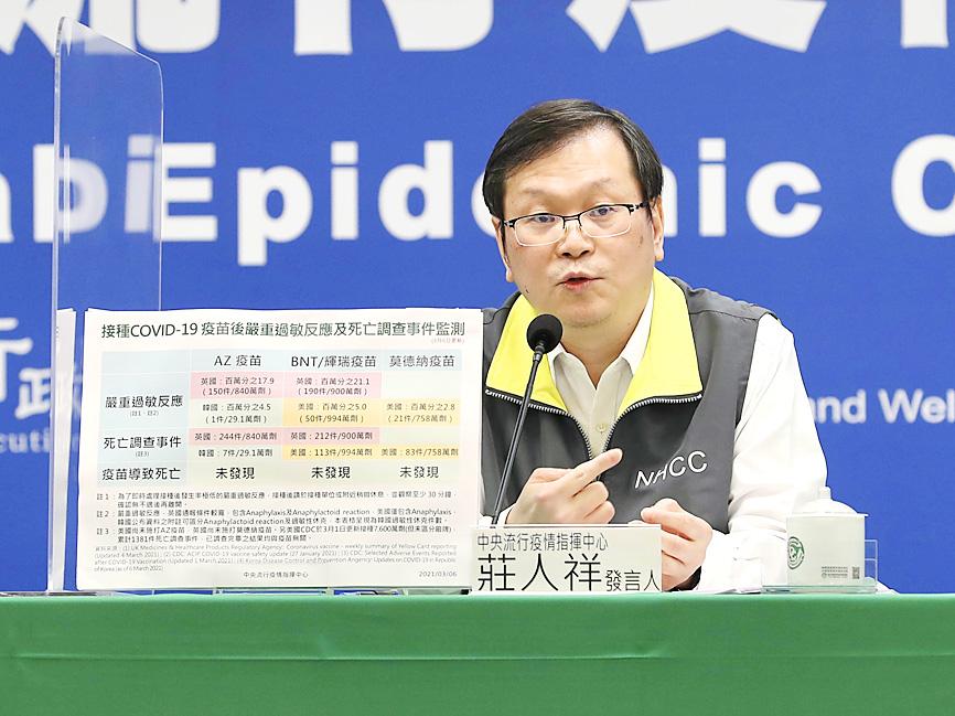 Centers for Disease Control (CDC) Deputy Director-General Chuang Jen-hsiang (莊人祥), who is the CECC’s spokesman, said that a few European countries have stopped administering AstraZeneca shots after reports of blood clots, adding that the European Medicines Agency (EMA) is investigating the cases.