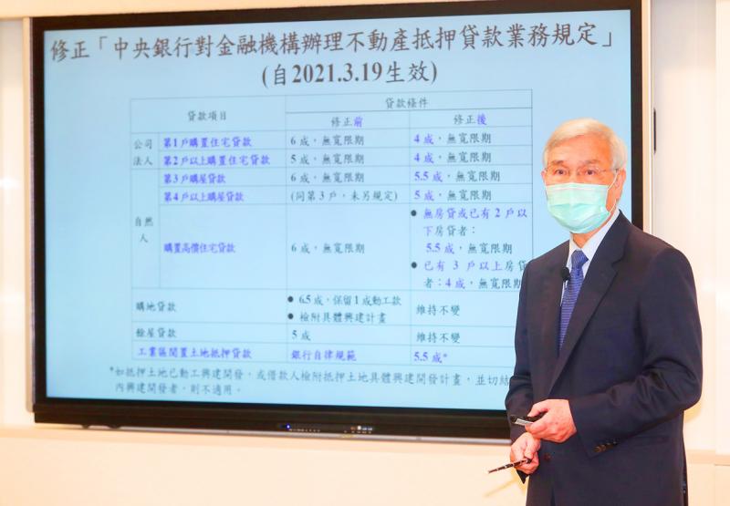 “The board decided to lower the LTV limit to 40 percent for all corporate buyers and 50 percent for multiple-home owners, to rein in house hoarding and property price hikes,” central bank Governor Yang Chin-long (楊金龍) told a media briefing after a quarterly board meeting in Taipei.