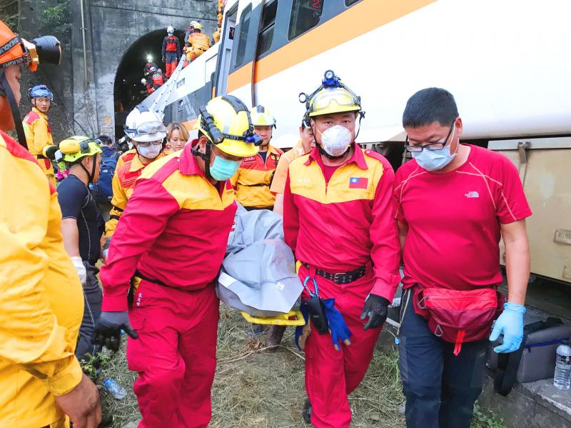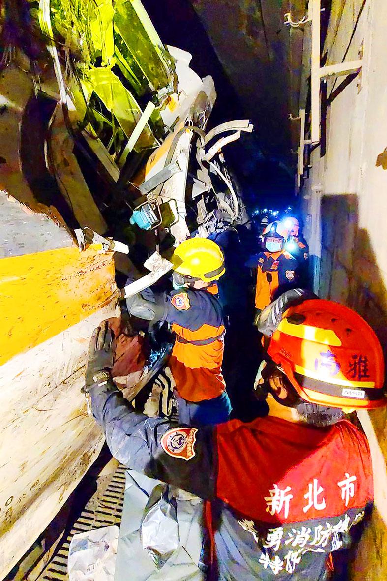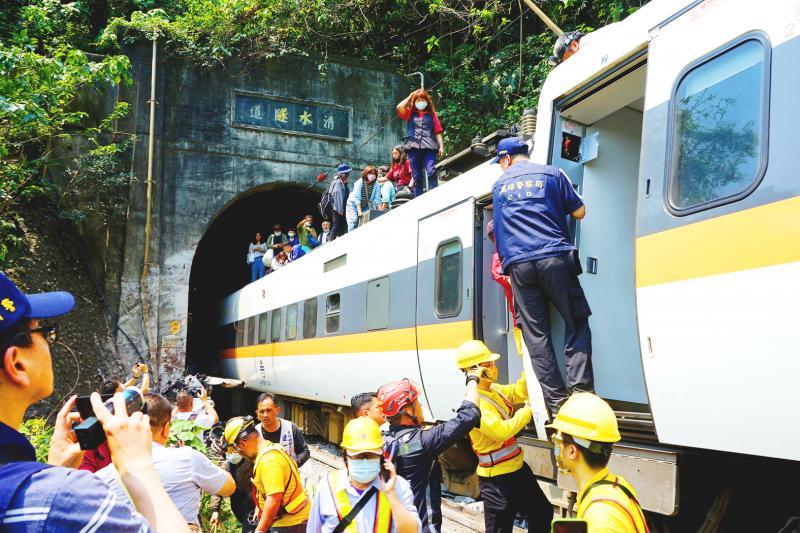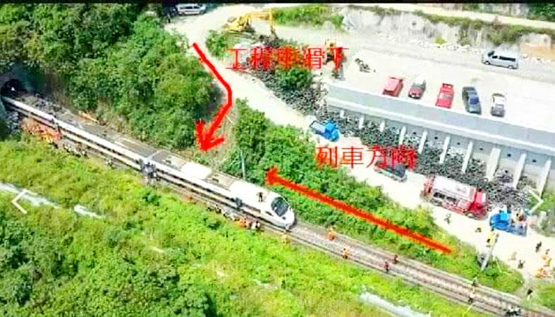 Taroko Express No. 408, which left New Taipei City’s Shulin Railway Station and was expected to arrive at Hualien Railway Station at 9:39am, struck a crane truck at 9:28am as the train was about to enter the Cingshuei Tunnel (清水隧道) in Hualien’s Sioulin Township (秀林), said the Taiwan Railways Administration (TRA), which operates the train.