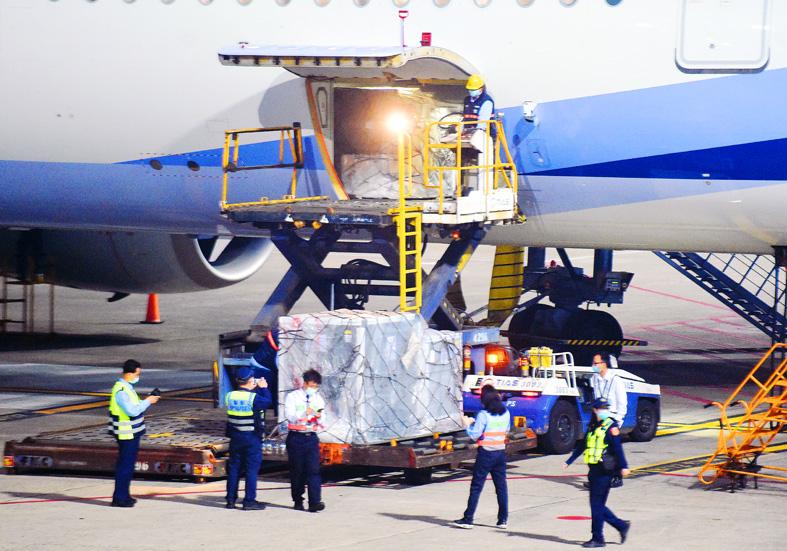 The 199,200 doses of the AstraZeneca vaccine were shipped from Amsterdam on a China Airlines (中華航空) plane and arrived at Taiwan Taoyuan International Airport at 5:21am.