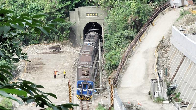 A local train carrying Minister of Transportation and Communications Lin Chia-lung (林佳龍), TRA Acting Director-General Chi Wen-chung (祁文中) and other passengers made the first scheduled run on the repaired track, departing from Yilan County at 5:27am and passing through the Cingshuei Tunnel.