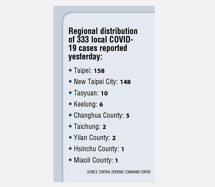 By region, 158 of the cases live in Taipei — including 89 cases in Wanhua District (萬華) — and 148 in New Taipei City — including 41 cases in Banciao District (板橋). The COVID-19 alert in the two municipalities was on Saturday raised to level 3.