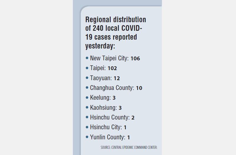 Taiwan yesterday recorded 240 local and five imported cases of COVID-19, the Central Epidemic Command Center (CECC) said at a press conference in Taipei, adding that two people died of the disease on Monday.