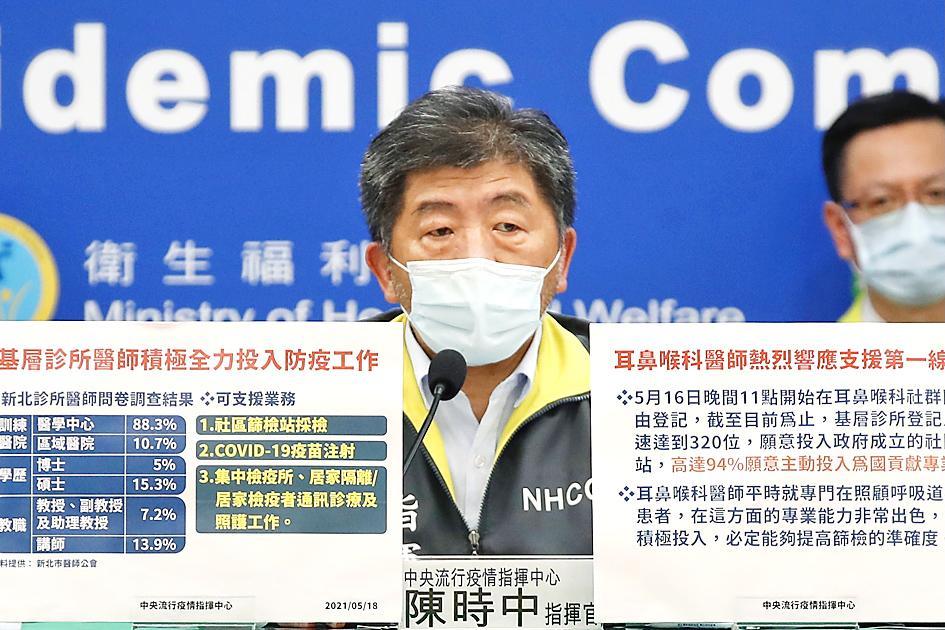 Changhua Christian Hospital Superintendent Chen Mu-kuan (陳穆寬), who is also the chairman of the Taiwan Society of Otorhinolaryngology-Head and Neck Surgery, said more than 320 ear, nose and throat primary care physicians have volunteered to help conduct COVID-19 tests at community testing stations.