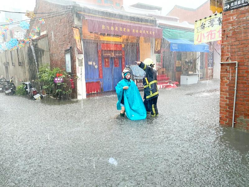 Television news footage showed people in Lukang Old Street (鹿港老街) wading through knee-high water and cleaning debris after the water receded.