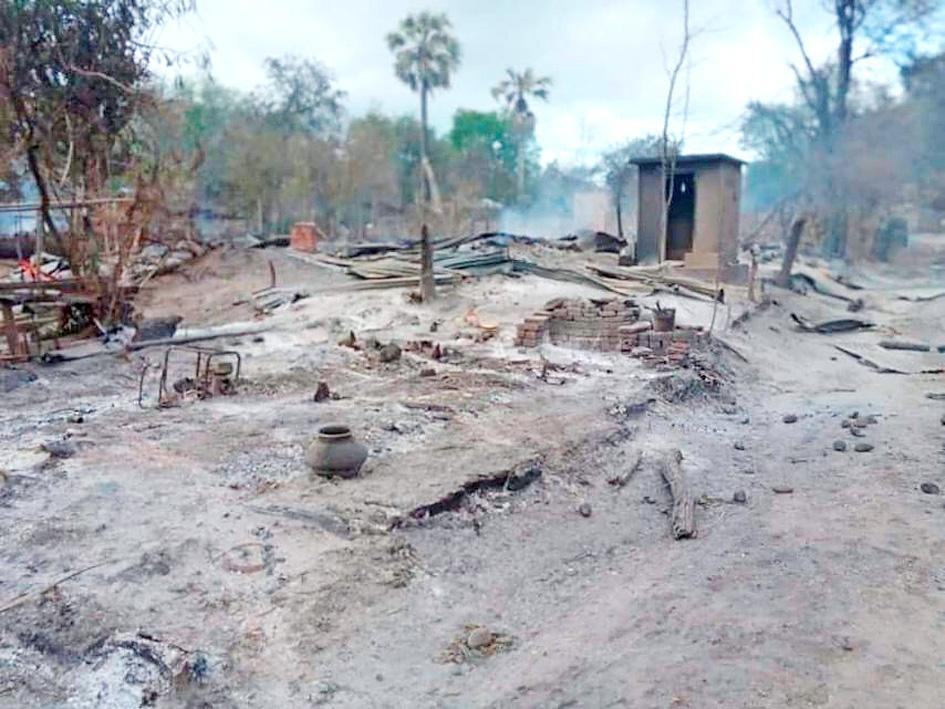 Photographs taken on Wednesday of the aftermath showed a thin haze of smoke above Kin Ma from white embers that smoldered on blackened ground. Burned planks of wood, sheet metal, bricks and cooking pots were scattered around, with only a few trees left standing. Some images showed animal carcasses.