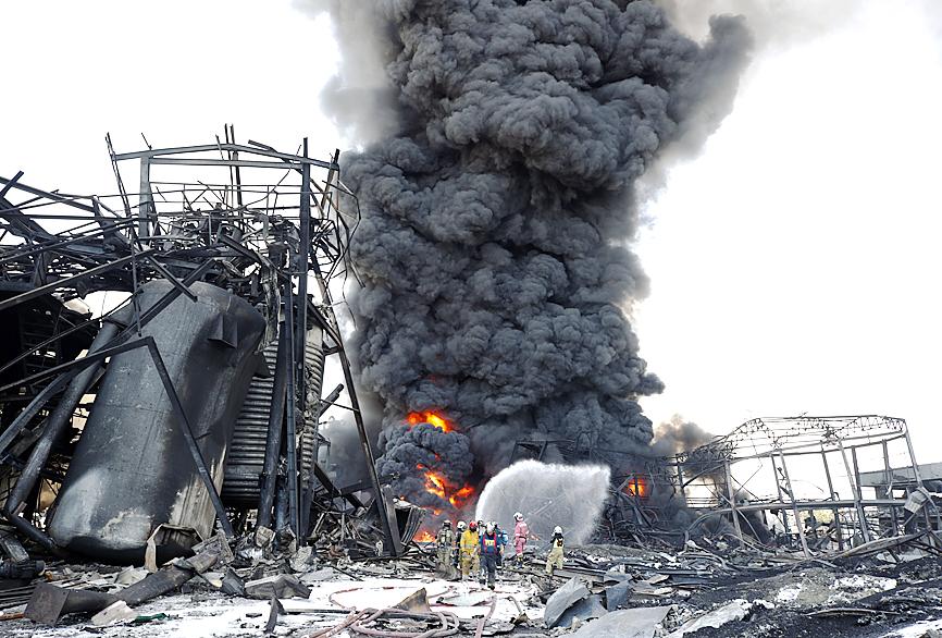The main blaze at the Ming Dih Chemical Co (明諦化學) factory had been brought under control by mid-morning, but an enormous tank containing the chemical styrene monomer continued to burn, disaster prevention official Chailit Suwannakitpong said.