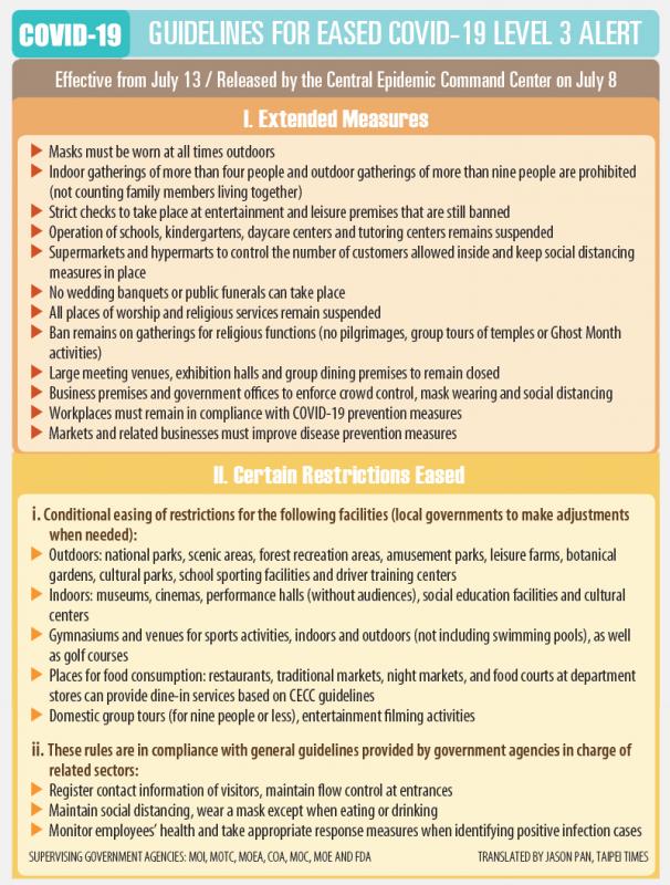The Central Epidemic Command Center (CECC) yesterday extended a nationwide level 3 COVID-19 alert to July 26, although some measures are to be relaxed on Tuesday next week.
