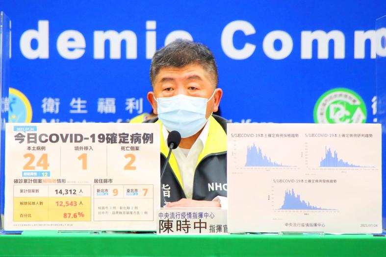 Minister of Health and Welfare Chen Shih-chung (陳時中), who heads the center, said 12 of the 24 local infections tested positive during isolation or upon ending isolation.