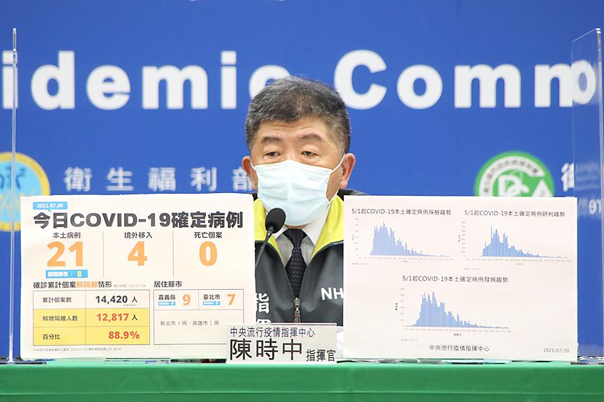 At its daily news briefing, the center reported 21 new local cases — nine in Chiayi, seven in Taipei, four in New Taipei City and one in Kaohsiung, with no new fatalities.
