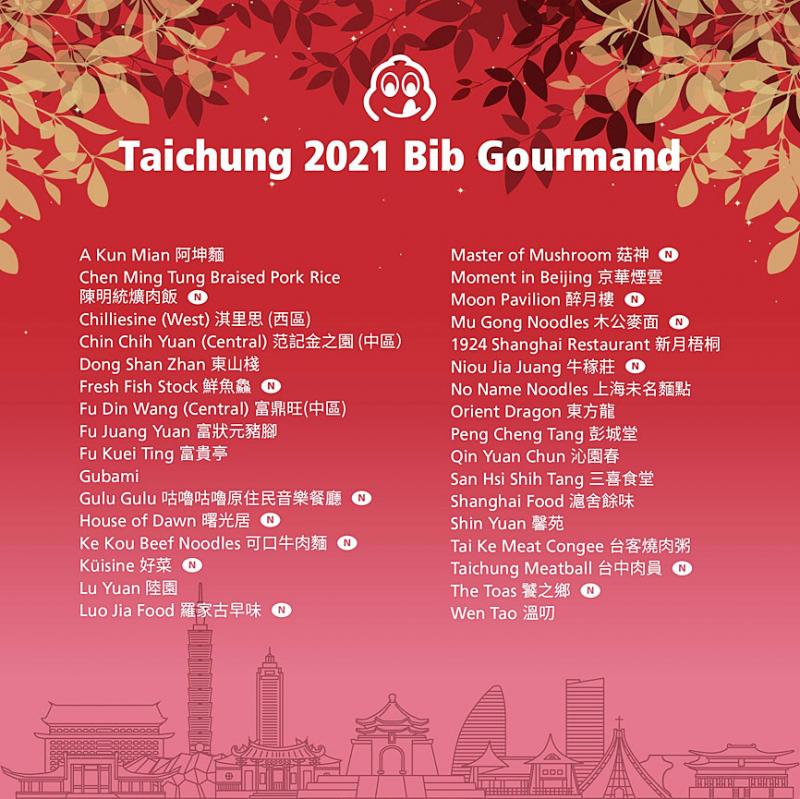 Four of the newly added eateries in Taichung serve Taiwanese dishes, the bureau said.