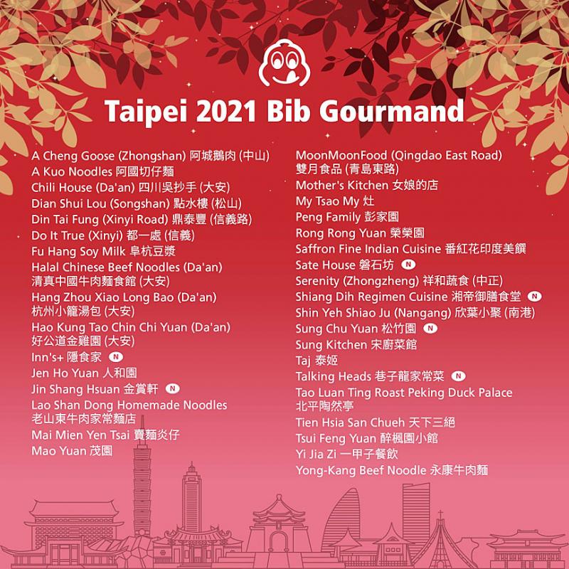 Ninety-one restaurants and street vendors in Taipei and Taichung made the Michelin Guide’s Bib Gourmand list this year, including 19 that were listed for the first time, the Tourism Bureau said yesterday.