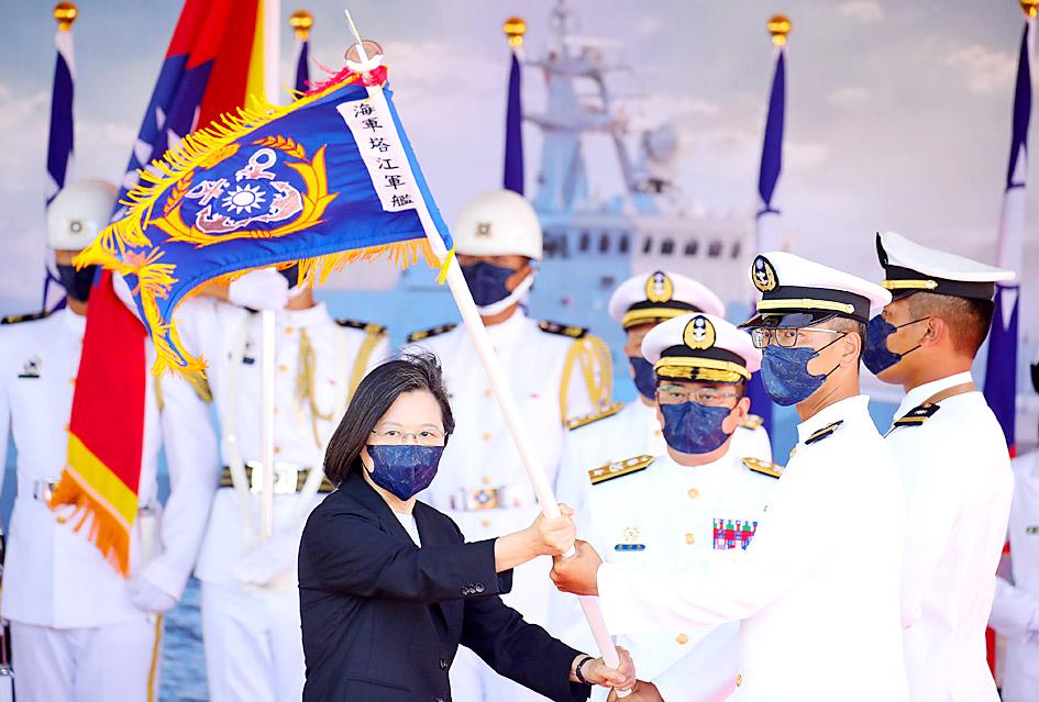 The Ta Chiang-class corvette, in entering service, would bolster the navy’s anti-air capabilities, demonstrate Taiwan’s resolve to defend its maritime borders and showcase domestic design in the service of national defense, President Tsai Ing-wen (蔡英文) told a ceremony at the military harbor in Yilan County’s Suao Township (蘇澳) yesterday.