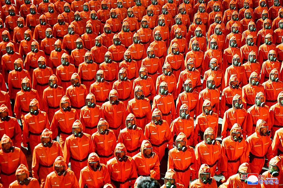The marchers also included anti-virus workers from the North Korean Ministry of Public Health, who paraded in bright red hazmat suits and masks.