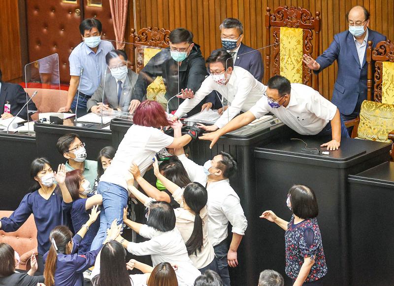 KMT legislators then shouted slogans demanding that Su apologize for the Democratic Progressive Party (DPP) government’s COVID-19 policies in an attempt to stop him from reporting to lawmakers.
