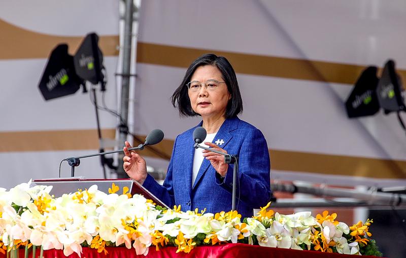 President Tsai Ing-wen (蔡英文) yesterday pledged to defend the nation’s sovereignty and democracy amid “unprecedented challenges” brought by China’s increasing military coercion, and to ensure Taiwan would not be forced to take the path China has laid out for it.