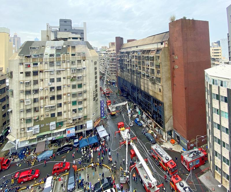 Flames and smoke billowed from the lower floors of the 13-story Cheng Chung Cheng (城中城) building on Fubei Road in Yancheng District (鹽埕), as firefighters tried to douse the blaze from the street and aerial platforms.