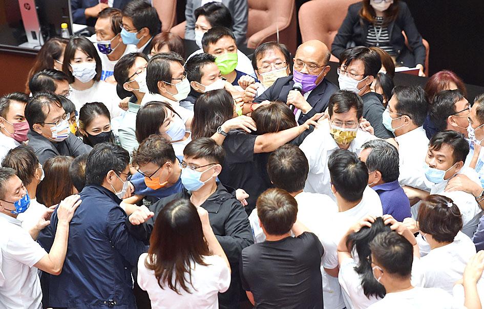 On Sept. 28, Democratic Progressive Party (DPP) and KMT lawmakers pushed and shoved each other amid a boycott by KMT legislators that stopped Premier Su Tseng-chang (蘇貞昌) from taking the podium.