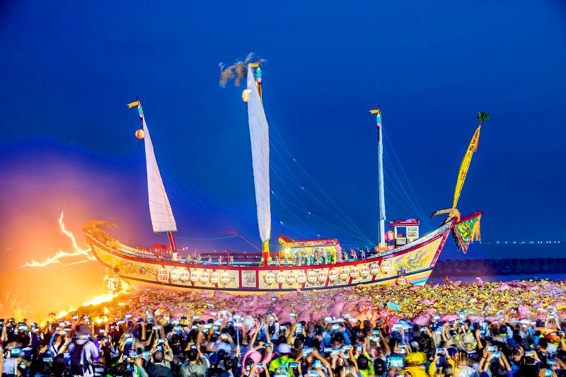 The King Boat, which cost about NT$10 million (US $359,453) to build, was transported to the beach at midnight and set on fire at 5:30am yesterday, symbolizing the “casting out” of plagues and the celestial lord returning to heaven.