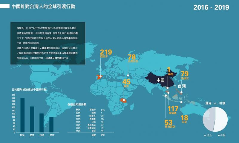 About 610 Taiwanese nationals accused of crimes in other countries were extradited to China from 2016 to 2019, international non-governmental organization (NGO) Safeguard Defenders said yesterday, calling on the international community to intervene in the practice.