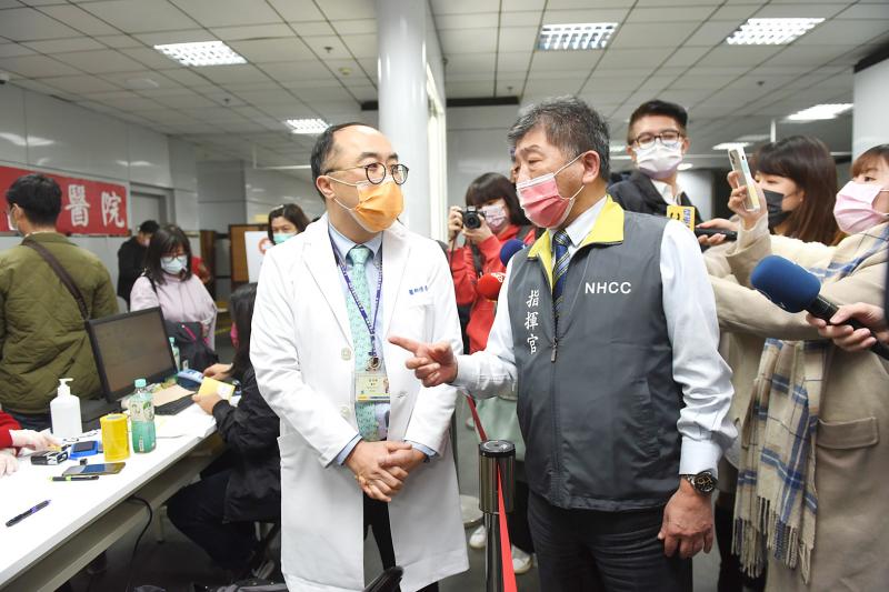 Chen and CDC officials yesterday visited a temporary vaccination center at Taipei Railway Station offering the Moderna vaccine to eligible recipients along with a NT$100 gift certificate.