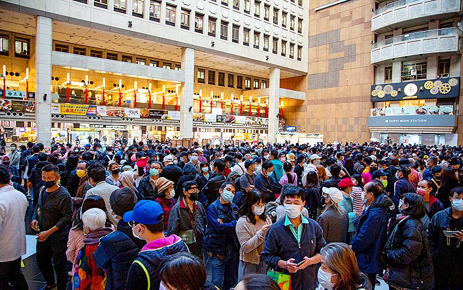 With the main hall of the station crowded with people lining up to get vaccinated yesterday afternoon, a large proportion of them migrant workers, CDC Deputy Director-General Chuang Jen-hsiang (莊人祥), who is CECC spokesperson, said people who lined up before 8pm would be guaranteed to get a dose.