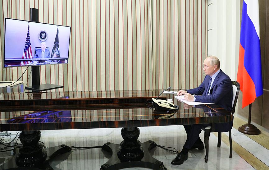 “I welcome you, Mr President,” Putin said, speaking with a Russian flag behind him and a video monitor showing Biden in front of him.