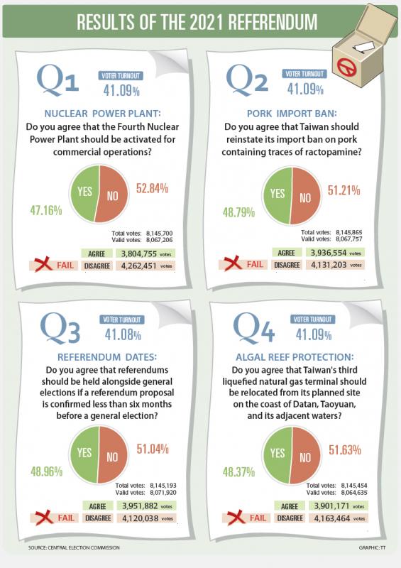 The Democratic Progressive Party (DPP) had urged people to vote against all four questions, while the main opposition KMT supported a “yes” vote for all of them.