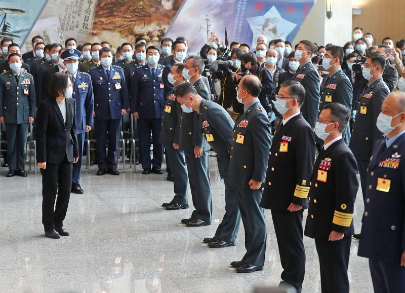 Speaking at a ceremony to promote 23 senior military personnel, Tsai said that the advancement of defense technology and the challenges posed by modern warfare mean that maintaining the combat readiness of Taiwan’s military depends largely on attracting and retaining talent in the armed forces.