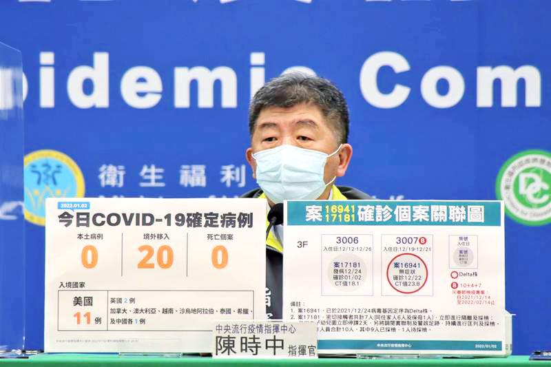 The second case — No. 16,941 — is a Taiwanese man who returned from the US and quarantined at the hotel from Dec. 19 to 21 before testing positive for COVID-19 on Dec. 22, with a Ct value of 23.8, Chen said, adding that the man stayed in room 3007, while the other man stayed in room 3006.