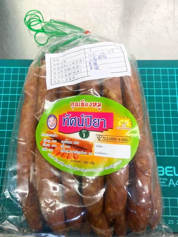 A package from Thailand was flagged by a post office in Tainan on Dec. 15 last year after it was found to contain sausages. A lab test on Dec. 17 found that the sausages contained the virus.