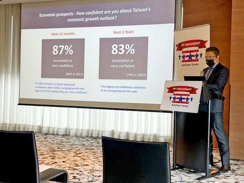Among the respondents, more than 87 percent expressed confidence in Taiwan’s economic growth over the next 12 months, while 83 percent were positive about the outlook over the next three years, the AmCham said.