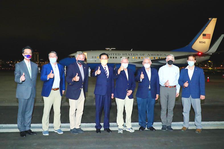 The group touched down at 7:40pm at Taipei International Airport (Songshan airport) on a US military aircraft, where they were received by Minister of Foreign Affairs Joseph Wu (吳釗燮), the Ministry of Foreign Affairs said in a news release welcoming the visitors.
