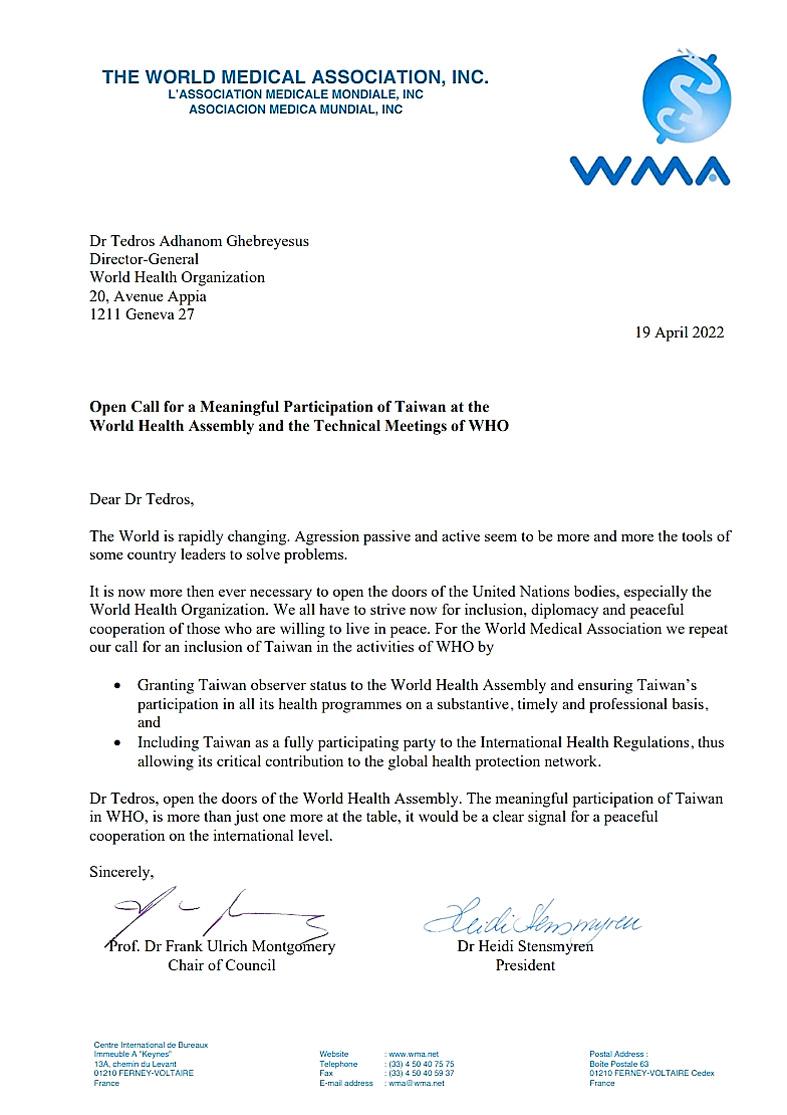 The World Medical Association (WMA) has called on WHO Director-General Tedros Adhanom Ghebreyesus to facilitate the meaningful participation of Taiwan at the World Health Assembly (WHA).