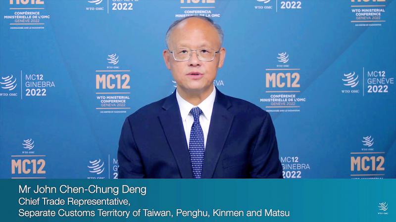 Minister Without Portfolio John Deng (鄧振中), Taiwan’s top trade negotiator, on Sunday urged all WTO members to pay attention to “arbitrary, untransparent measures” that harm the rules-based multilateral trading system at the global trade organization’s ministerial conference in Geneva, Switzerland.