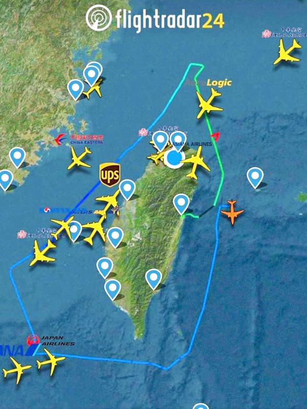 The Teng Yun 2 No. 1812 departed from Chiashan Air Base in Hualien County at 6:46pm on Saturday and flew on a counter-clockwise route along the edge of the ADIZ, circling Taiwan proper, the institute said.
