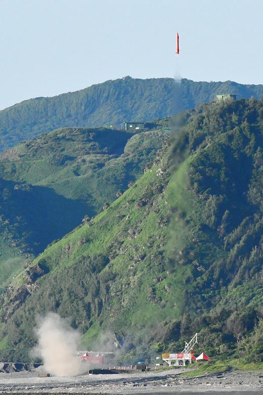 The test, which was originally scheduled for May 3, began at 6:12am yesterday, with the rocket launching from Syuhai Village (旭海) in Pingtung County’s Mudan Township (牡丹).